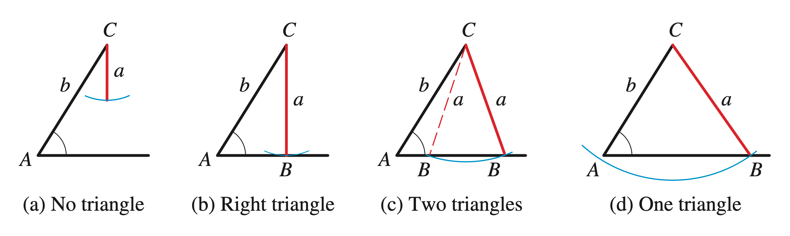 This can be used for solving the first two cases mentioned earlier: or , and . or always determine a unique triangle while is called the ambiguous case because the given angle and two sides may form two, one or no triangles: one side may be too short to form a triangle or just enough to have two possibilities.