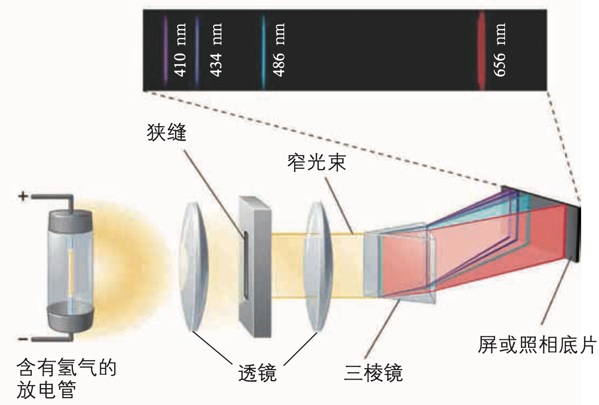 如下图所示,对氢气放电管通电,氢气解离为气态氢原子,发出紫光,透过棱镜得到氢原子光谱。